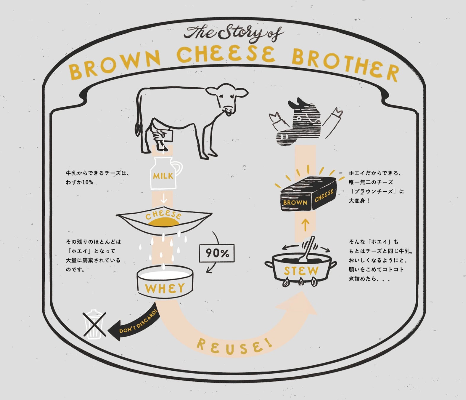 生乳から取れるチーズの量は10%ほど。残り90%程度を占めるのがホエイ(乳清)となります。本来ホエイ(乳清)は、食べられるものですが使い道がなく、安価に取引されていたことから何かできないかと製造をスタートし、誕生したのが「BROWN CHEESE BROTHER」です。