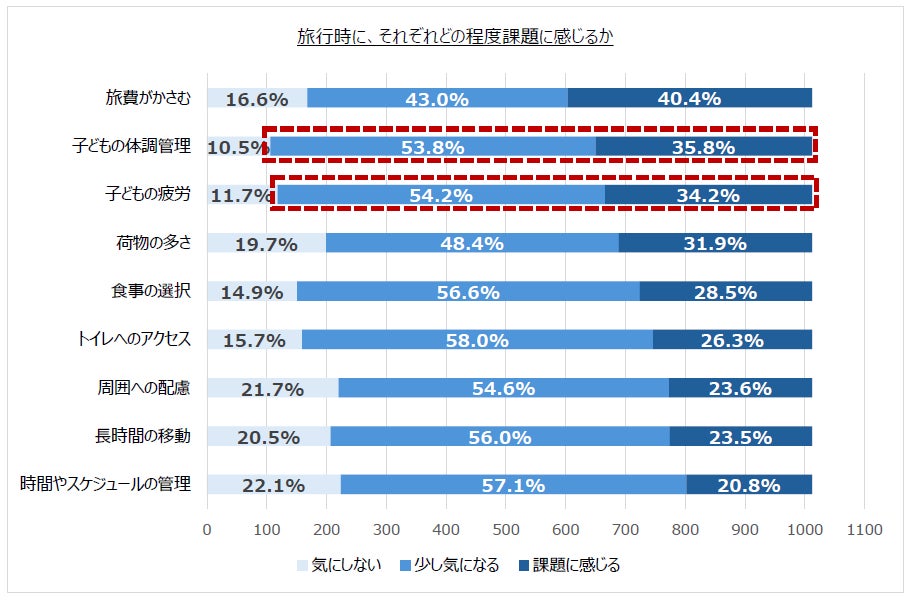 実際に、当社が今年3月に実施した調査(※3)では、子連れでの旅行時の「課題」として、費用面に次ぐ形で「子どもの体調管理」(約35.8%)、「子どもの疲労」(約34.2%)、「荷物の多さ」(約31.3%)が上位に挙げられました。子どもの体調管理と疲労については、「少し気になる」と回答した人を合わせると、いずれも9割に迫る結果です。