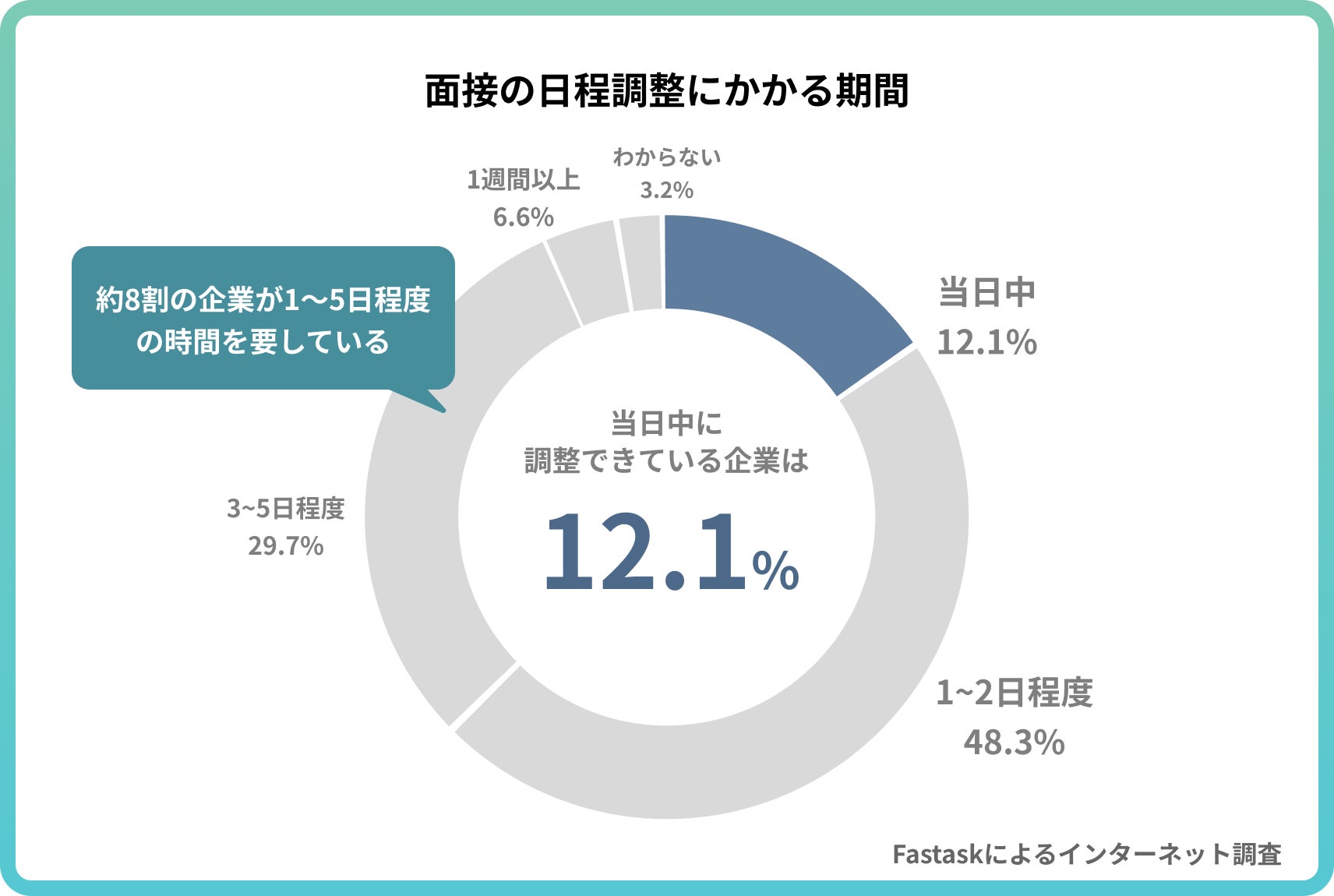 一方で、実際に面接日程調整に要している時間を見ると、「1〜2日程度」が48.3%、「3〜5日程度」が29.7%となっており、約8割の企業が1〜5日を要している実態が明らかになりました。理想と現実の間には、1〜3日程度の差が生じています。