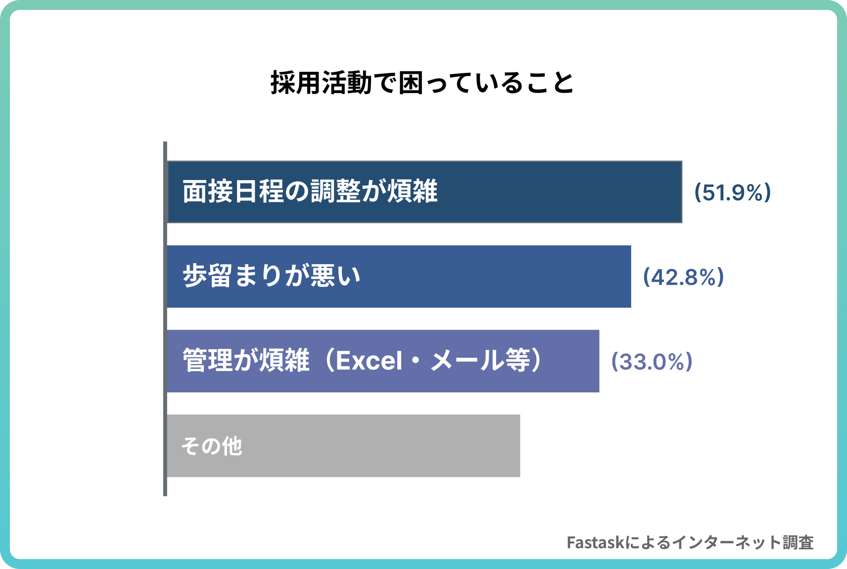 また、「採用活動で困っていること」を尋ねた設問では、「面接日程の調整が煩雑」が51.9%で最多となりました。応募数や内定辞退といった課題よりも、日程調整そのものが採用活動の大きな負担になっていることがうかがえます。