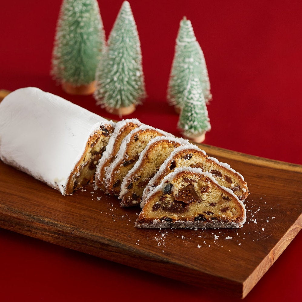 発酵パン生地にラムレーズン、いちじく赤ワイン漬け、オレンジピール、レモンピール、きざみアーモンドをたっぷり練り込んで焼き上げました。