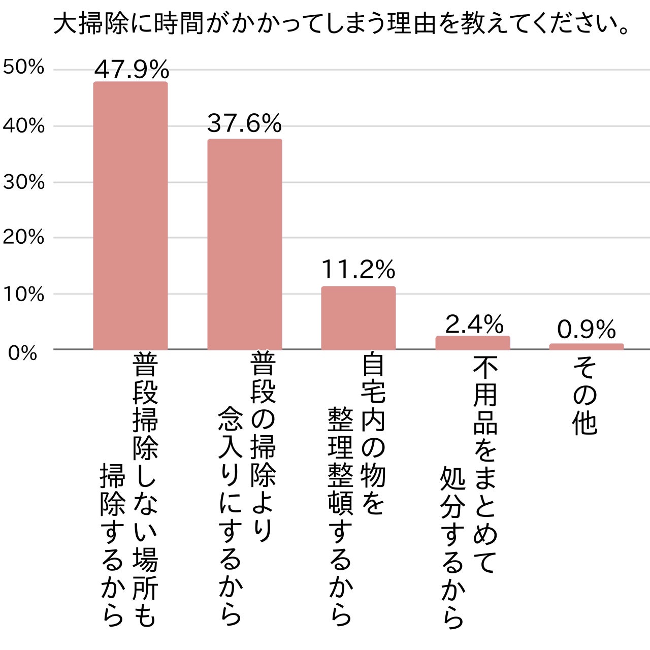 大掃除は時間がかかると感じている方が8割超ですが、どうして時間がかかってしまうのでしょうか。回答者が感じている「時間がかかる理由」について尋ねました。