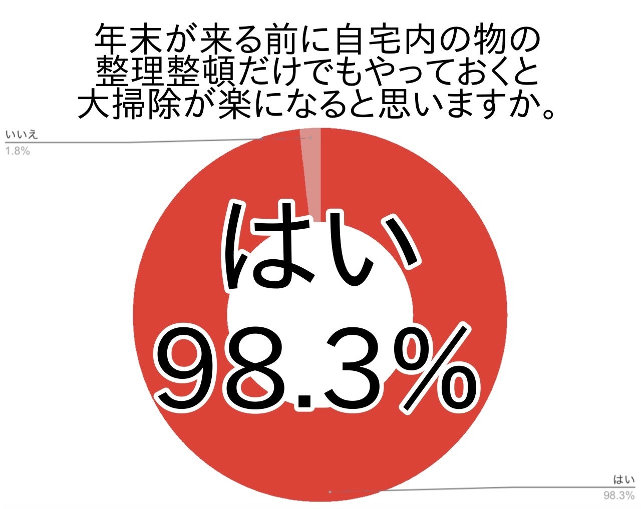 掃除自体は年末できるだけお正月に近い日にして、部屋を汚さないまま新年を迎えることが理想的かもしれませんが、片付け・荷物整理は大掃除の前の時期にあらかじめ済ませておくことができます。そこで、年末が来る前にあらかじめ自宅内の物の整理整頓をやっておくと大掃除が楽になると思うかを尋ねてみました。