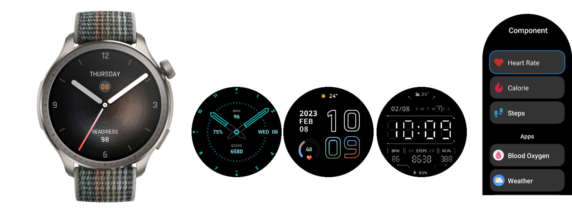 Amazfit Balanceは、どの丸形ディスプレイよりも大きい1.5インチのHD AMOLED ディスプレイを搭載。また、スクリーン対ボディ比が73.4%、解像度も480×480と、GTR4よりもさらに高くなっており、視認性に優れています。さらに、200以上のウォッチフェイスの中で、新機能として編集が可能な常時表示モードのウォッチフェイスを搭載しています。