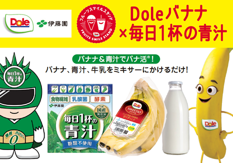 株式会社ドール(本社:東京都中央区、代表取締役社長 青木 寛、以下 Dole) は、フルーツの新しい可能性を発信すべく、2023年夏に実施し大好評だった食べて・遊んで・学べるフルーツ体験型イベント「Dole フルーツスマイルパーク/スタンド」を全国の小売店にて定期的に実施し、様々な食品メーカーとコラボレーションしたプロジェクトを開始します。プロジェクト第1弾となる今回は、毎月7日 Doleバナ活の日と毎月8日 スッキリ美腸の日に合わせ2024年4月6日(土)と7日(日)にピーコックストア 自由が丘 デュ アオーネ店にて、伊藤園の「毎日1杯の青汁」とコラボレーションしたオリジナルのスムージーの作り方を紹介いたします。