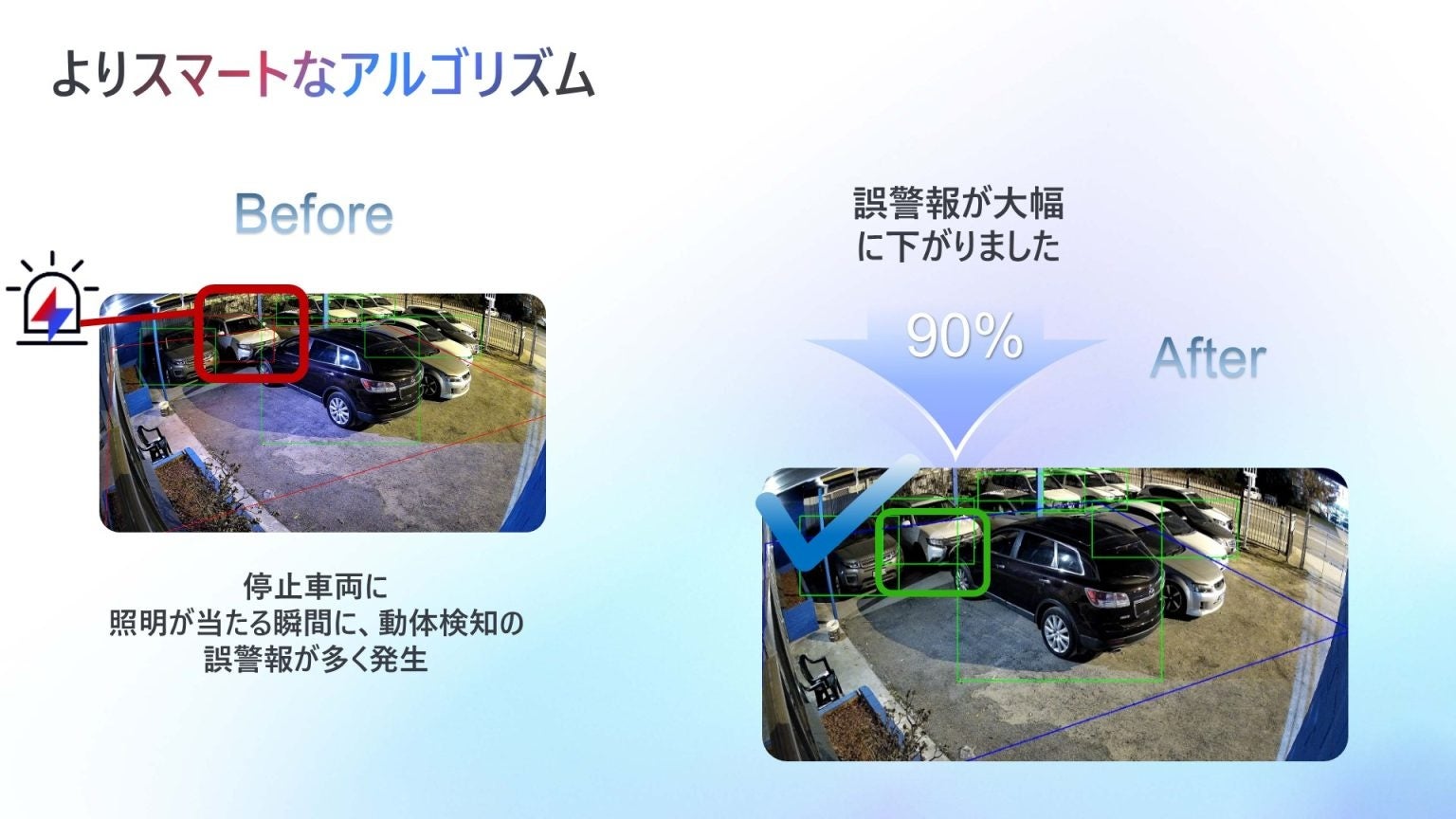 停止車両に照明が当たる場合の誤警報が90%削減されました。