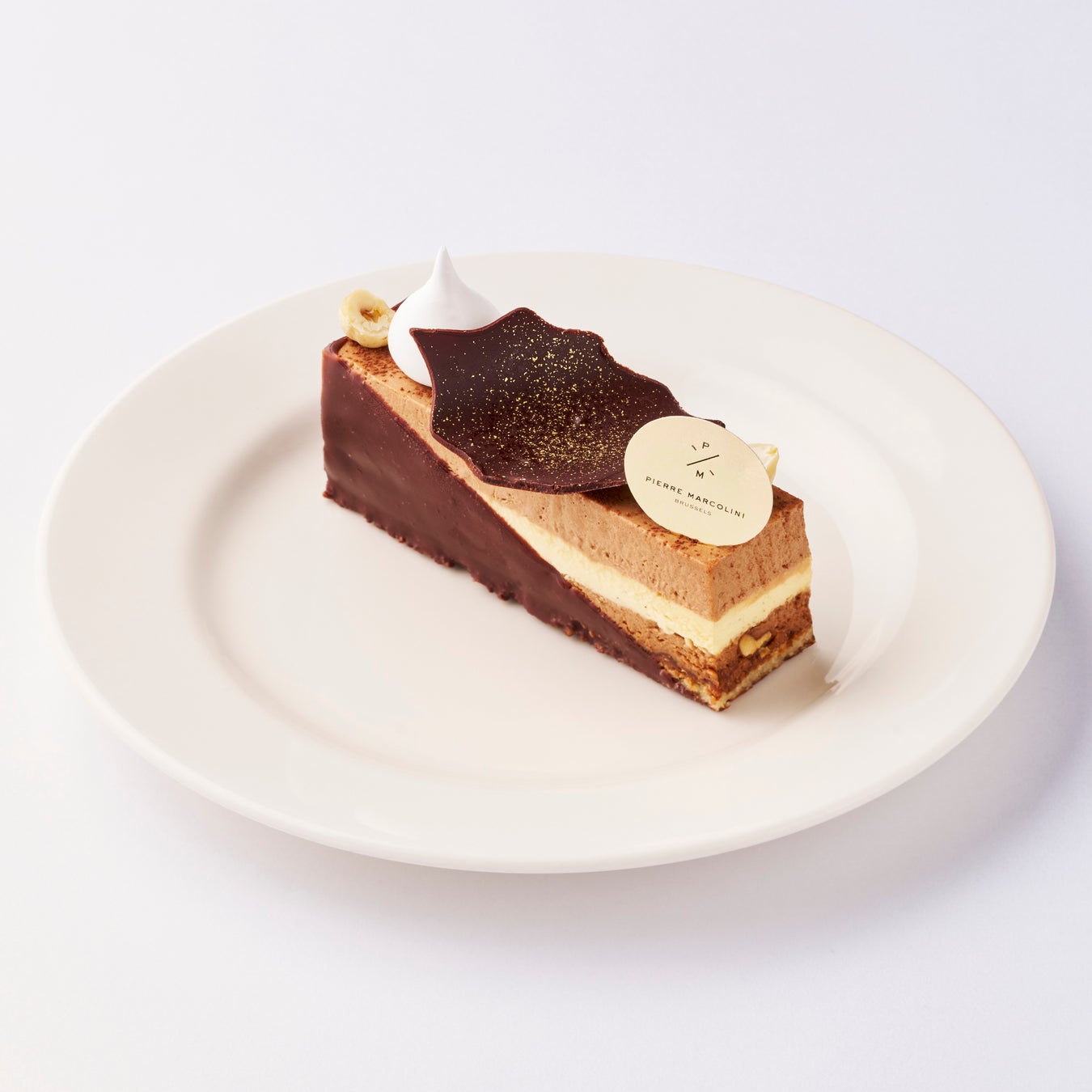 ピエール マルコリーニのオリジナルクーベルチュールで香り豊かに仕上げたショコラのムースと、軽い食感のバニラのクレムー。フィアンティーヌとダックワーズの食感もお楽しみいただける、贅沢なクリスマスケーキです。お持ち帰りも可能です。