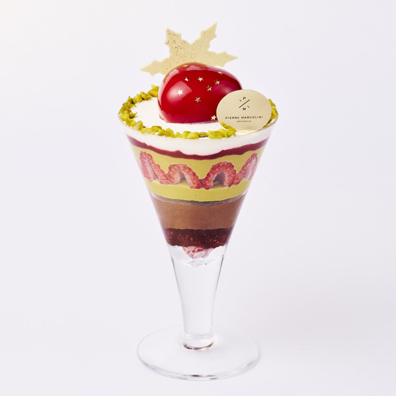 カカオの風味豊かなピエール マルコリーニのチョコレート アイスクリームと、イタリア シシリー産のピスタチオを贅沢に使用したアイスクリーム、フレッシュな酸味のフランボワーズを重ねたクリスマス限定パフェです。トップに輝くハート型のフランボワーズ ムース、雪の結晶のオーナメントが華やかさを添えています。