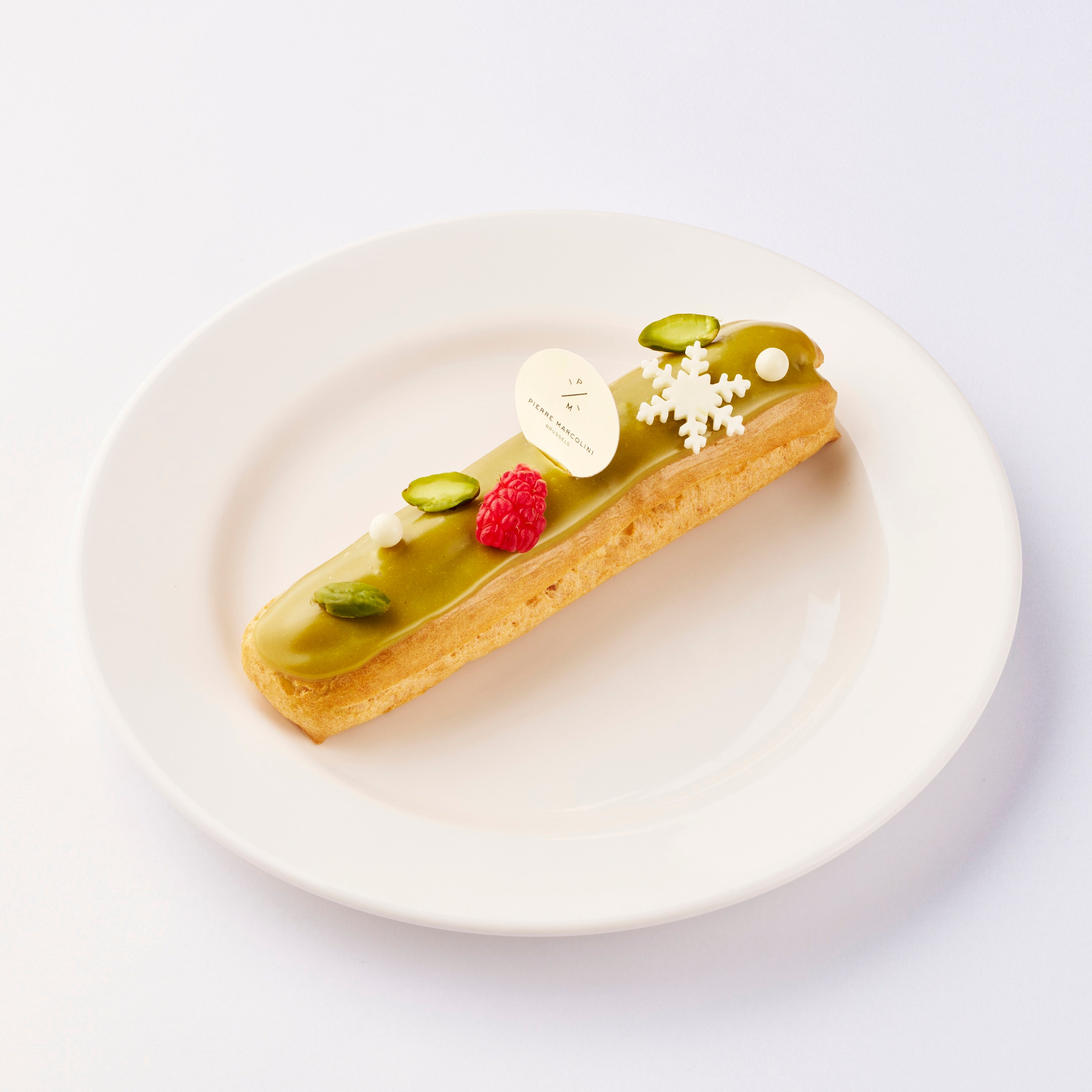 フランボワーズが香るやさしい甘さのクリームに、ピスタチオのグラサージュ。雪の結晶のオーナメント、ピスタチオ、フランボワーズをトッピングしたクリスマス限定のエクレアです。お持ち帰りも可能です。