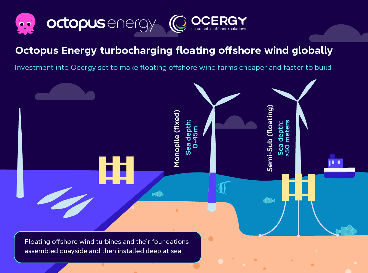 英オクトパスエナジーは本日、オクトパスエナジー・グループの電源開発部門(オクトパスエナジー・ジェネレーション)によるOcergy社への出資を発表しました。これにより、世界中の浮体式洋上風力発電所の建設がより安価に、より迅速に行えるようになります。Ocergy社は、浮体式洋上風力発電所の設計・製造における革新的なアプローチをとり、浮体式洋上風力発電所市場に新しい価値をもたらし、建設にかかる時間とコストを大幅に削減しています。