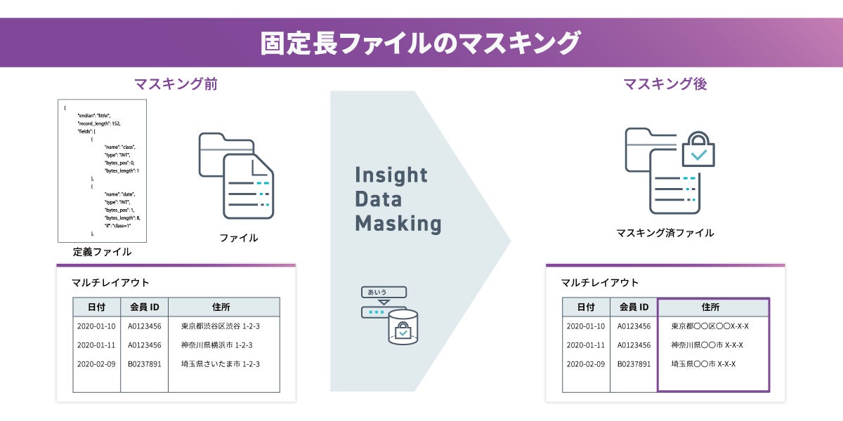 固定長データは文字情報の桁数が決まっており、その決まった桁数の中にデータ項目が決まった位置に配置されています。例えば、1〜8桁が購入日、9〜12桁が伝票番号といったように、決まった桁数に固定の項目が割り当てられています。固定長ファイルに対してマスキングを行う場合、マスキング後にデータの長さや、桁ごとの特有のルールが変わらないよう変換することが必要です。Insight Data Masking Ver. 3.4では、桁数の長さはもちろん、桁ごとの固有のルールに対応したマスキングが可能となりました。システム移行時に桁の長さ・固有のルールまで含め、より本番に近いデータでテストを行うことができます。