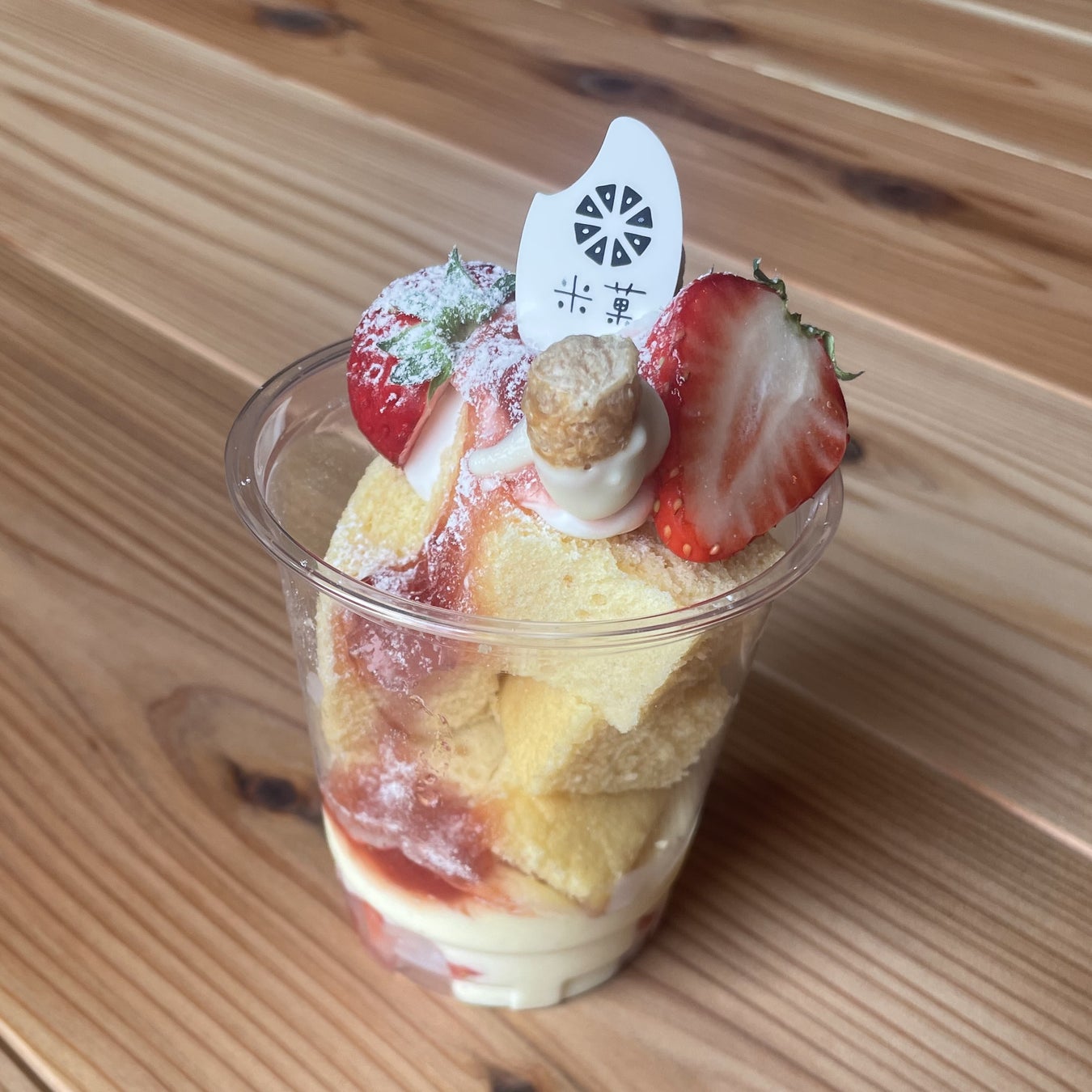 「米菓バウムパフェ」は米粉バウムクーヘンをふんだんに使用した、バウムクーヘンといちごとカスタードのパフェです。甘いカスタードと甘酸っぱいいちごがバウムクーヘンとぴったりな味わいに仕上がっています。『米菓』オープン初日には完売した「米菓バウムパフェ」、ぜひ一度お試しください。