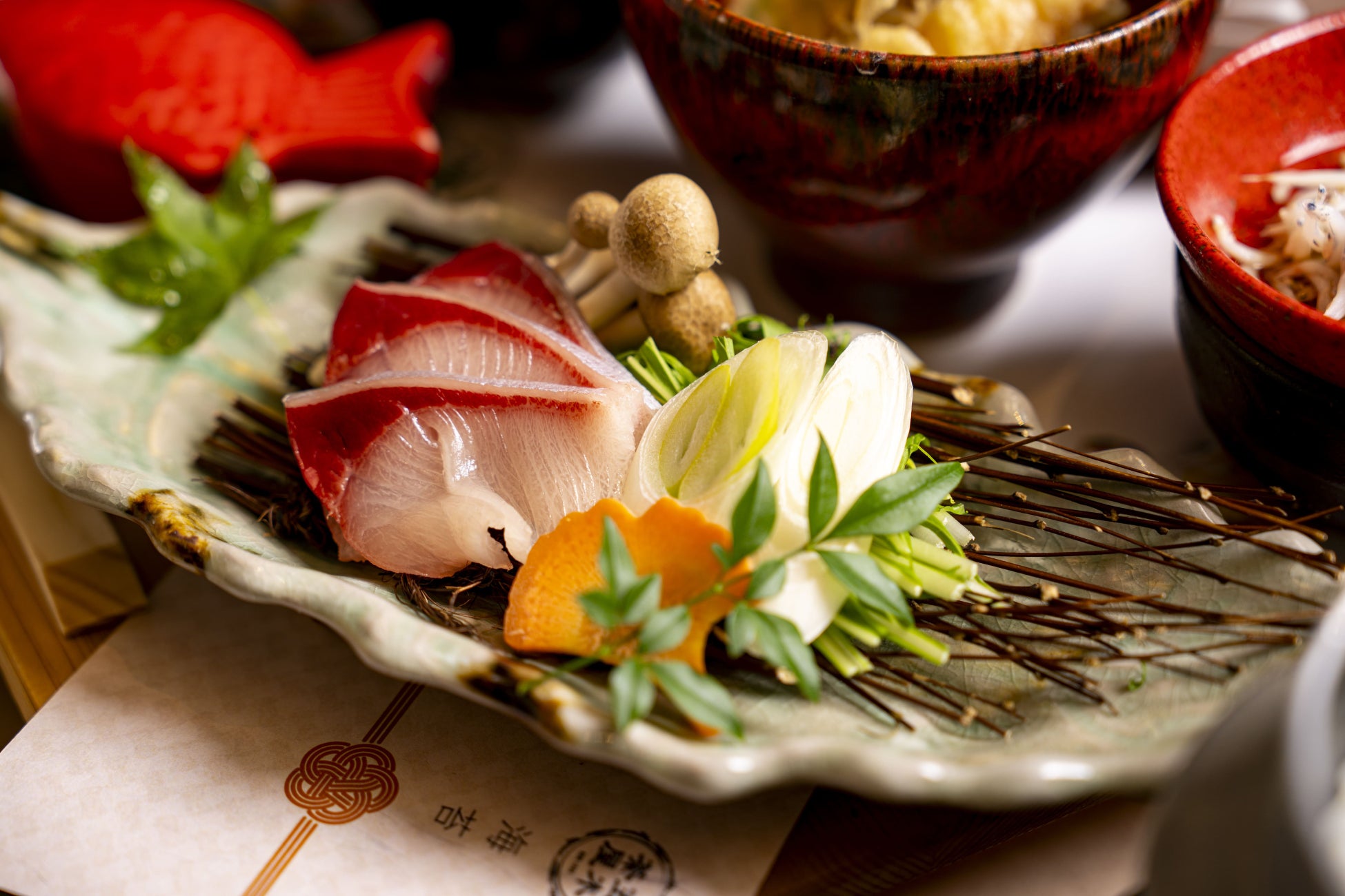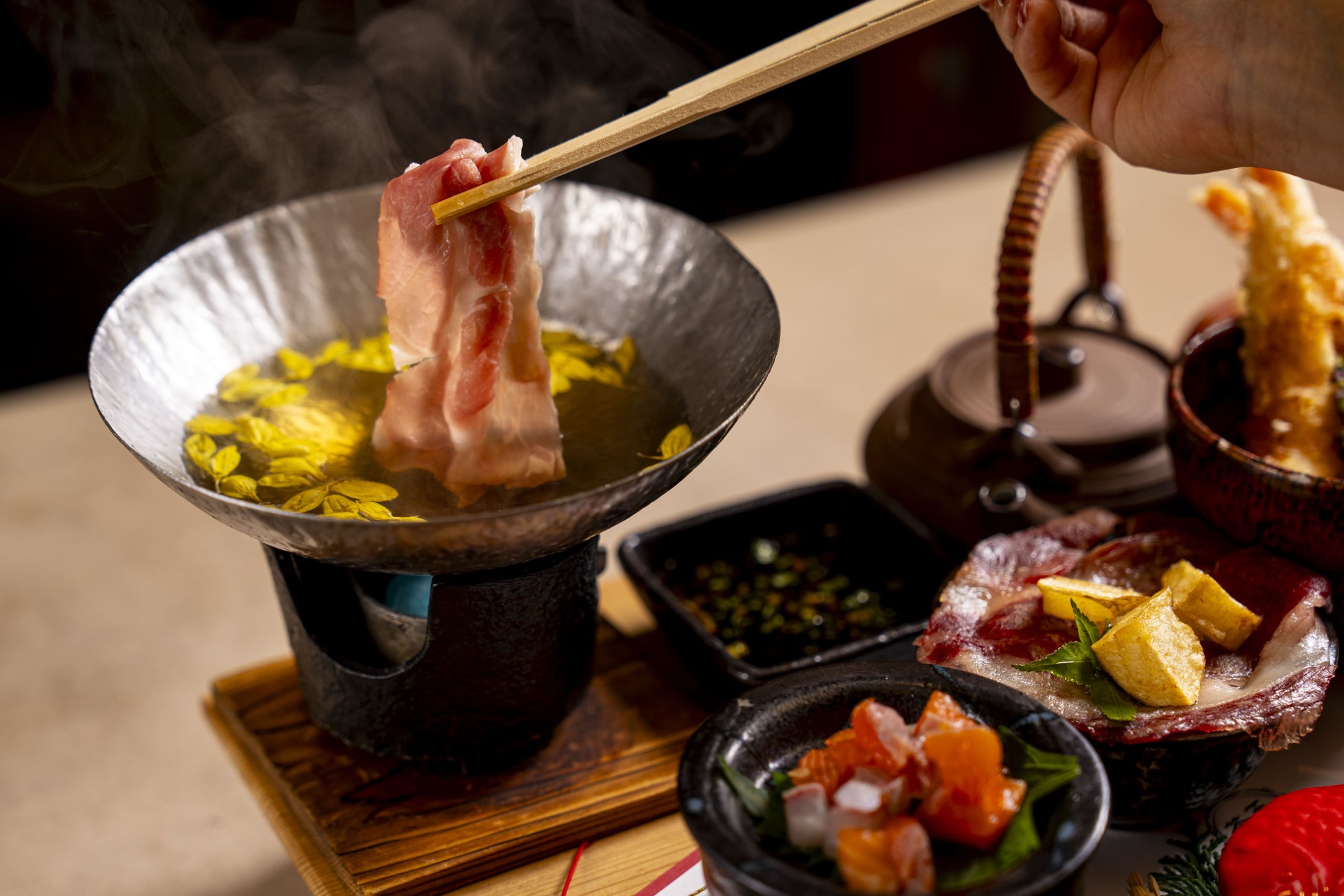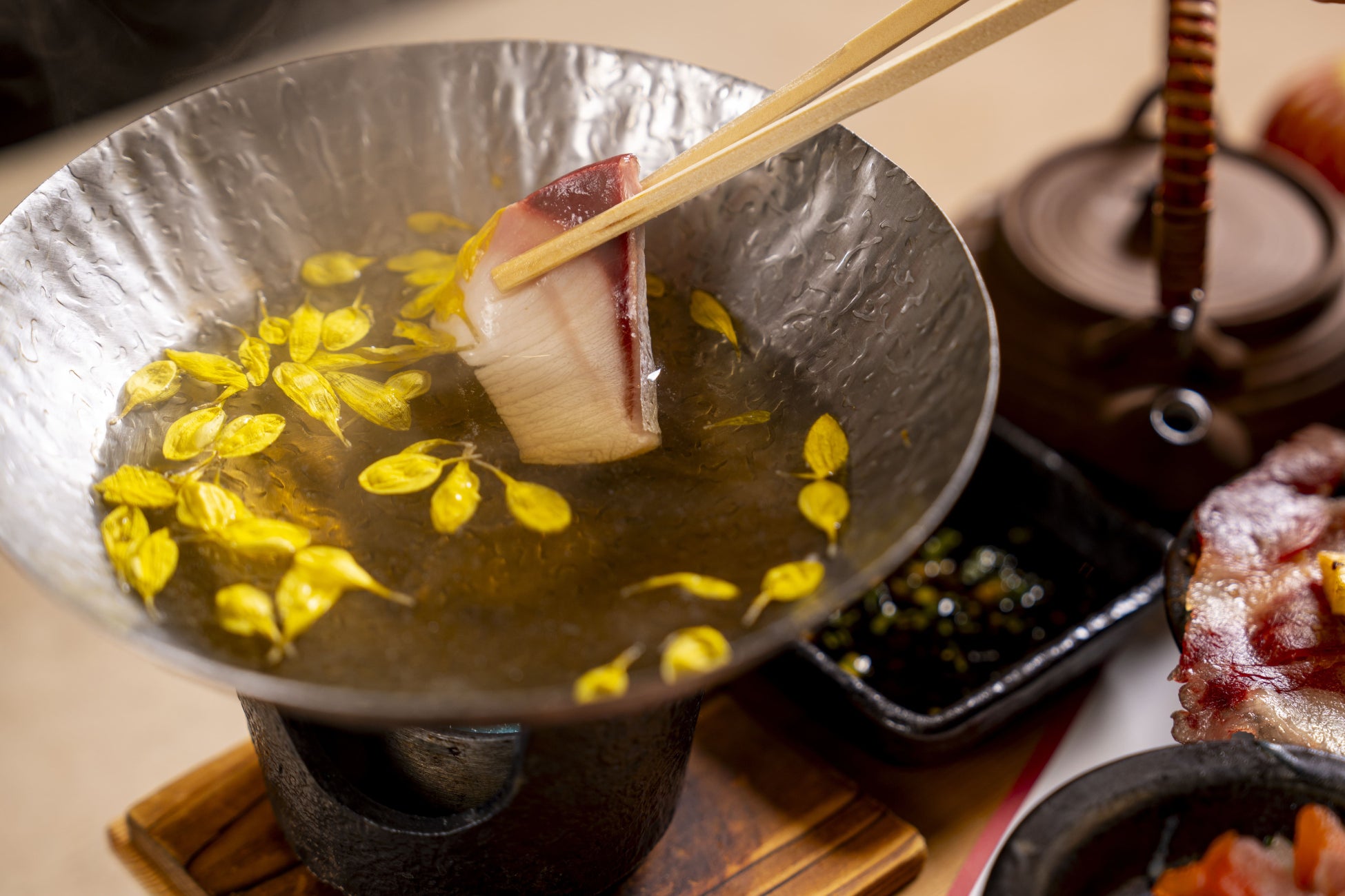 冬の味覚、脂ののった鰤を五木茶屋特製の出汁でさっとしゃぶしゃぶに。