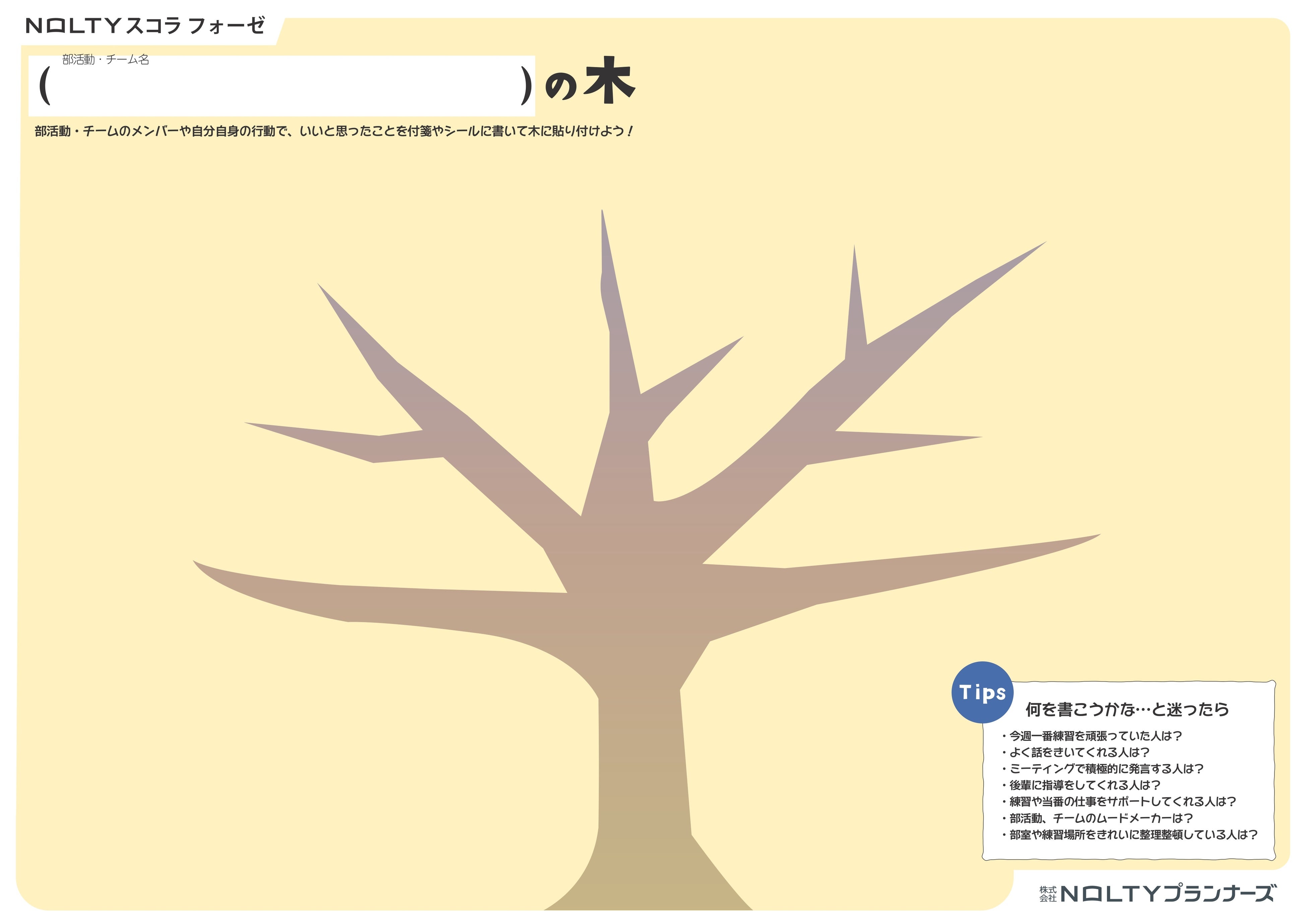 本プログラムでは、ノートの週間ページにある「今週がんばっていた部員・メンバー」欄にその週の活動でよかったと思うメンバーを記入します。さらにメンバーの良いところを書いて貼り出すポスター「チームの木」を活用することで、周囲に目を向け、良いところを見つけるきっかけを作ります。実際にあるチームでは「1週間のMVPを書くことで、メンバーの良いところを改めて発見するだけでなく、自分のいいところも見つけられるようになって自己肯定感が上がった」という声が上がっています。
