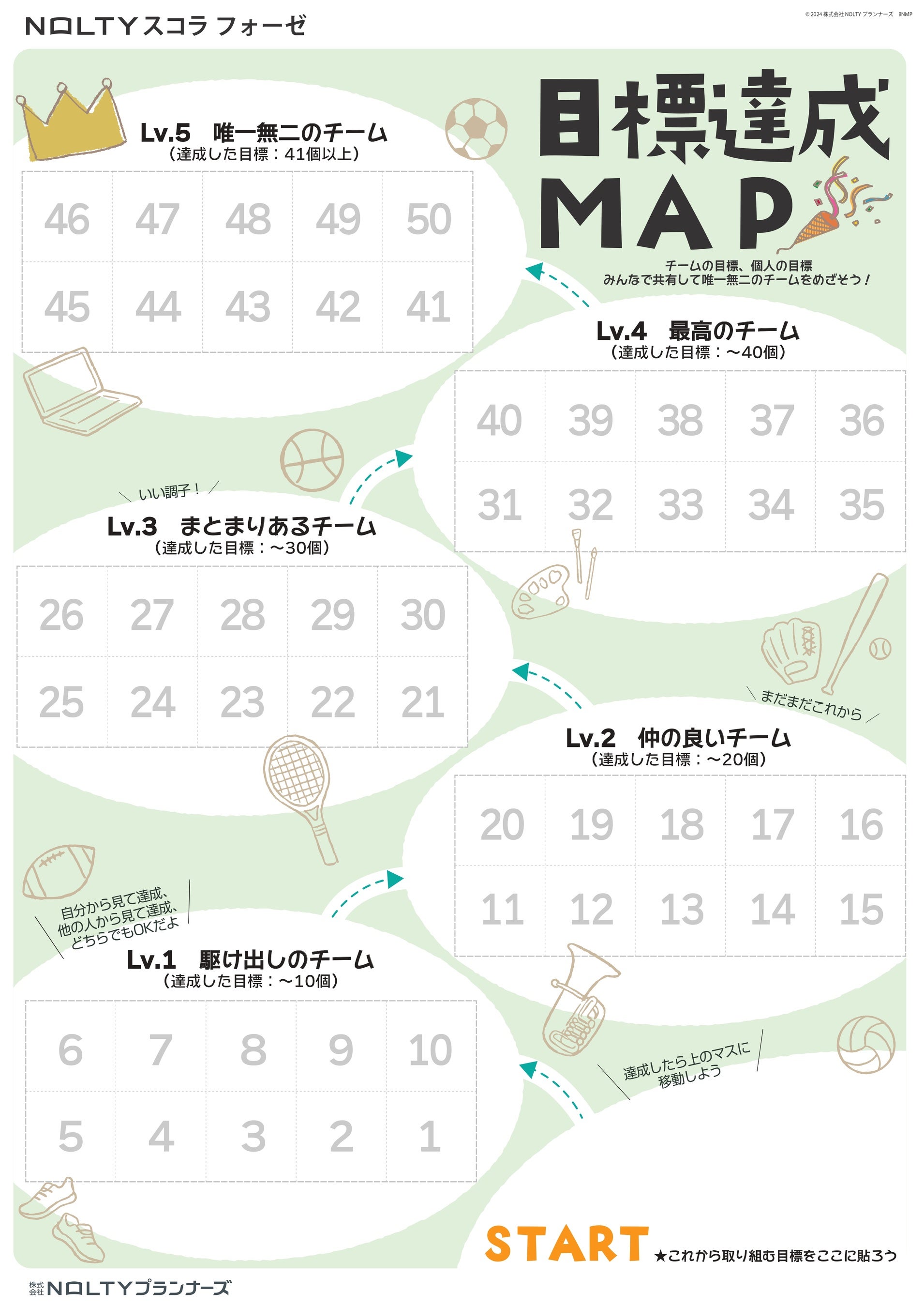 今回のリニューアルで新たに開発したポスター「目標達成MAP」は、目標を付箋に書いて貼り出すツールです。チーム全体の目標だけでなく個人の目標も貼り出して共有することで一人ひとりの成長が見える化され、メンバー一人ひとりのチーム貢献がわかることで、チームビルディングが達成されます。