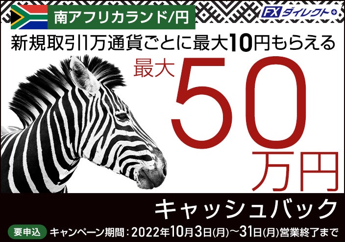 キャンペーンに申し込まれたお客さまに、期間中におけるFXダイレクトプラスでの南アフリカランド/円の新規取引合計数量に応じて、最大500,000円【新規取引1万通貨ごとに最大10円】をキャッシュバックします。