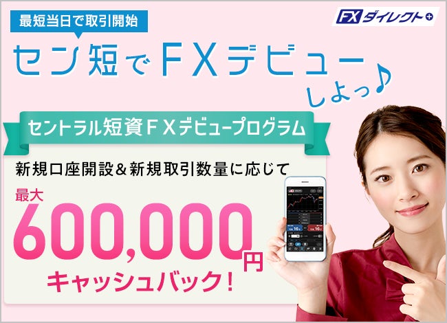 2022年5月2日以降、セントラル短資FXで初めて口座を開設されたお客さまに、口座開設月から翌々月末までにおけるFXダイレクトプラスでの新規取引合計数量に応じて、最大600,000円をキャッシュバックします。