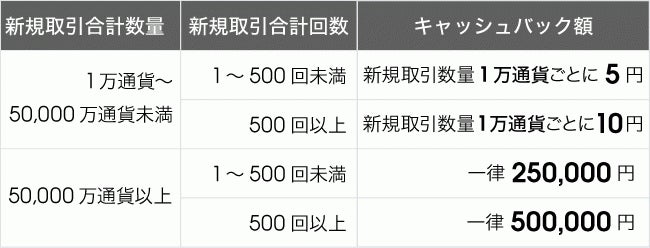 ・10万通貨単位で、100回新規取引(計1,000万通貨) ⇒ 5,000円キャッシュバック