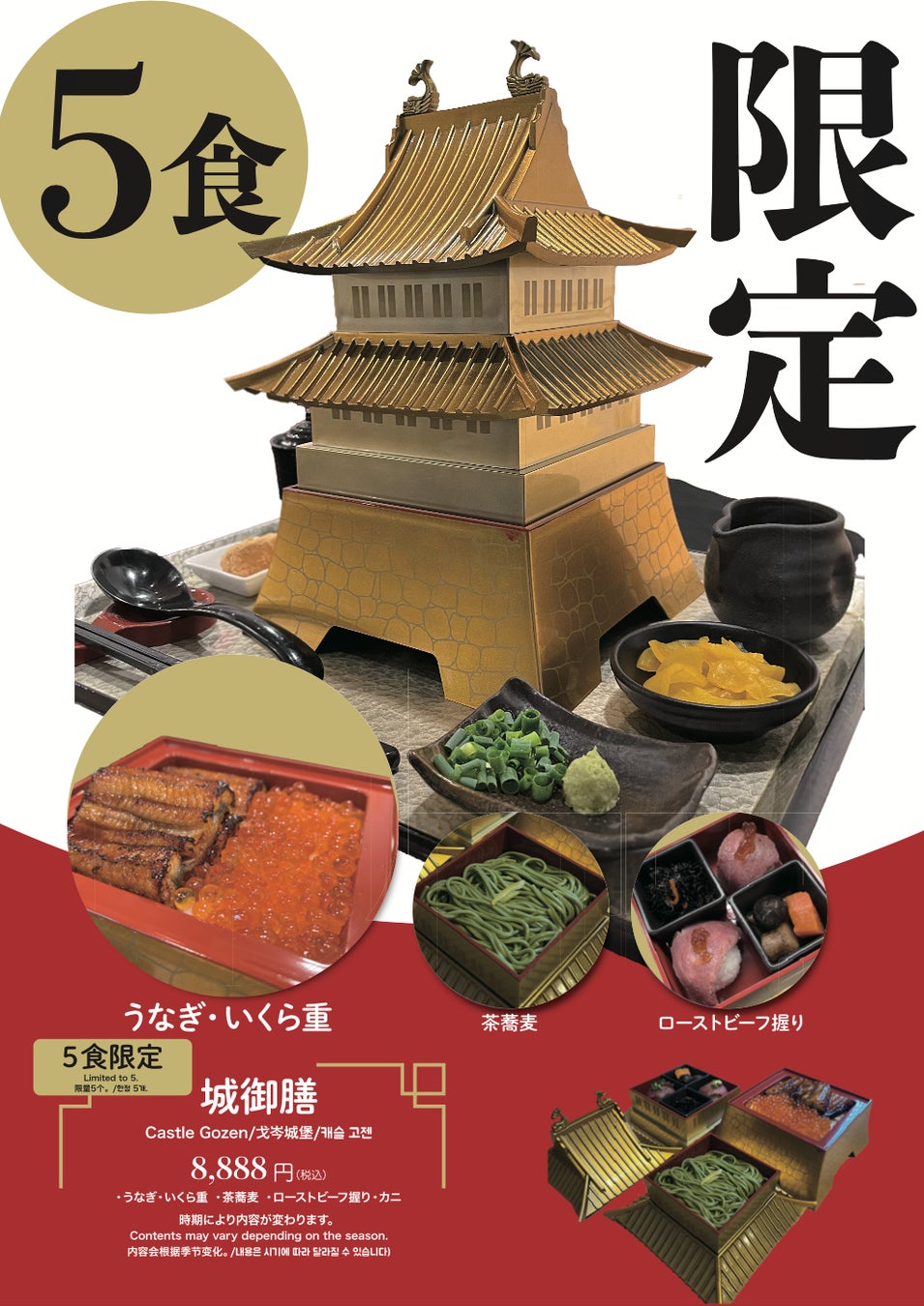 「城御膳」は、大阪城を模した特製の入れ物に、厳選されたニホンウナギ、茶そば、神戸牛、いくら、カニ料理を詰め合わせた豪華な御膳となっております。この特別なメニューは、見た目の美しさと、味の深みの両方をお楽しみいただけます。*季節により変動あり。