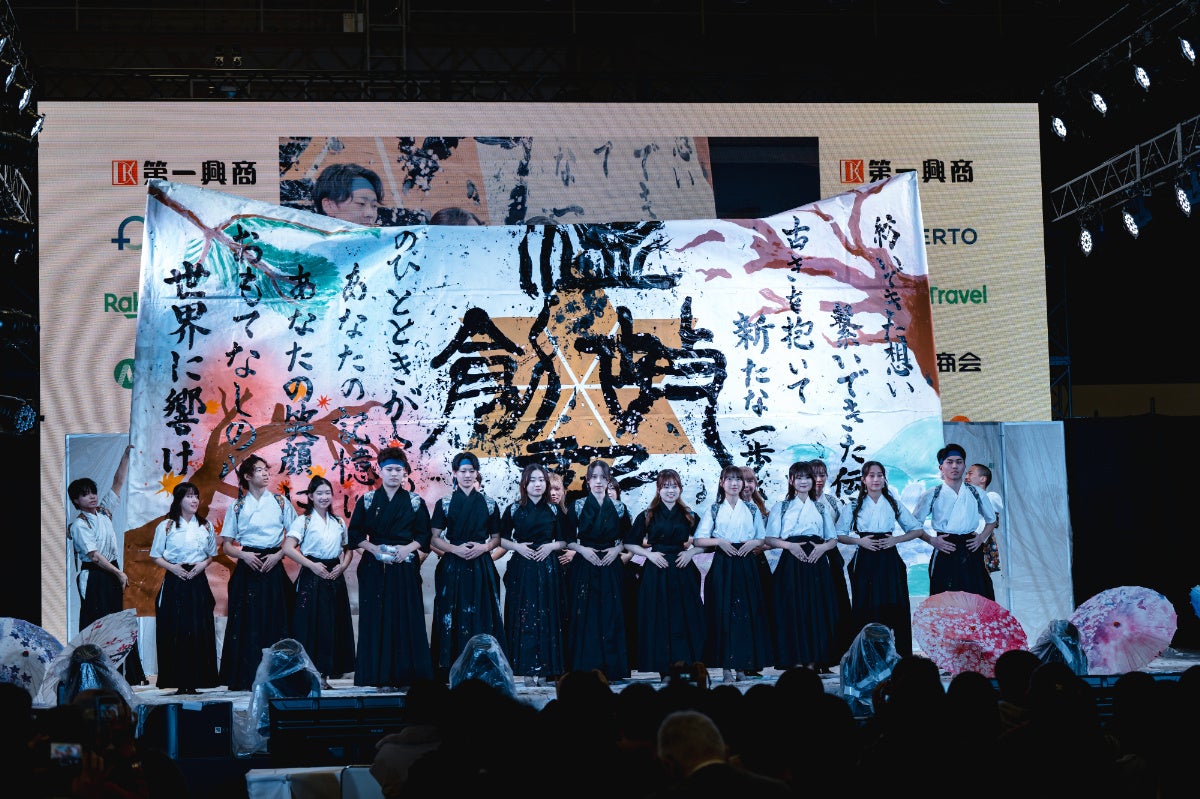 徳島からは 躍動感あふれる阿波踊り、沖縄からは 力強い琉球太鼓と華やかなエイサー が披露され、会場を沸かせました。さらに、早稲田大学 “漣” による ダイナミックな書道パフォーマンス も行われ、観客を魅了。