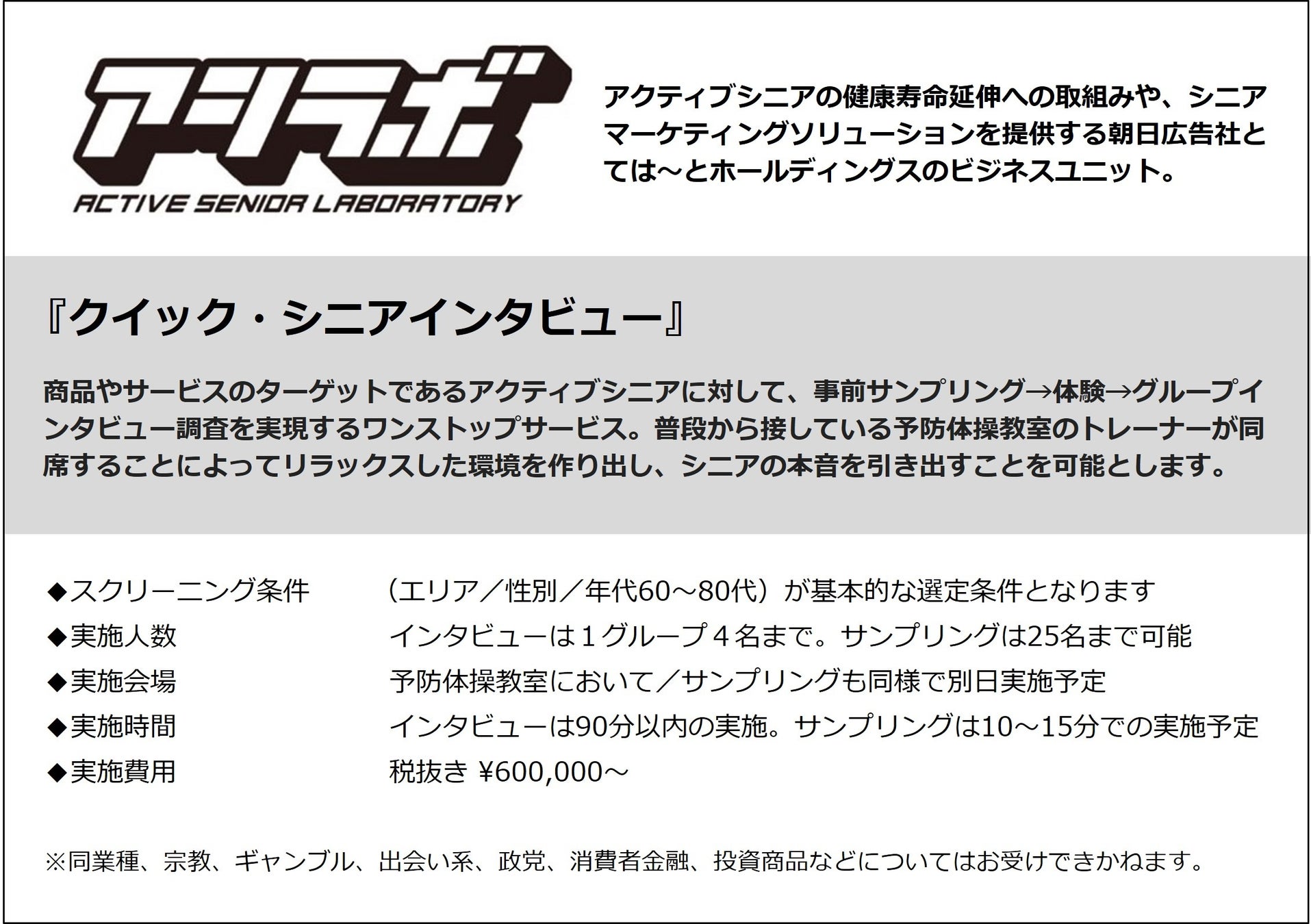 その一環として、ては~とホールディングス株式会社(本社:神奈川県藤沢市/代表取締役社長兼グループCEO:後藤 康太)とビジネスユニット「アシラボ」を発足させ、令和のアクティブシニアの健康寿命延伸への取組みや、シニアマーケティングソリューションの提供を開始。新サービスとしてシニア向け予防体操教室参加者を対象とした『クイック・シニアインタビュー』の提供を開始しました。