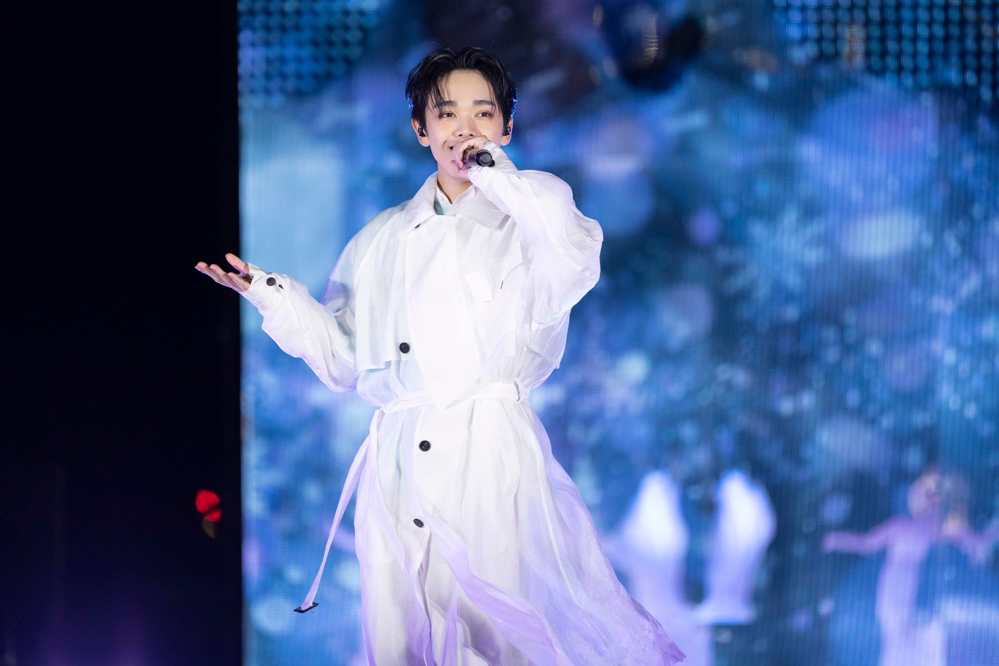 トークセッションを終えて、いよいよ新曲「白く染まる前に」のドローンショーとのコラボを予定していたが、基準を上回る強風となり、30分ほど風がおさまるのを待ったが、あえなく本人との共演は中止に。宮世本人は「風速が強くてドローンは飛べなくなってしまいました。待っている間みんな寒かったでしょう?帰ったらあったかいお湯につかって風邪ひかないように気を付けてね」と、ずっと待っていたファンを気遣った。本人降壇の一時間後には風もおさまり、本人不在の中、新曲「白く染まる前に」の歌詞とリンクする形で、ドローンが夜空に粉雪を降らせる。モノリスに映し出された映像もリンクし、会場をRyubi Miyaseの作り出す世界観に引き込んでいった。