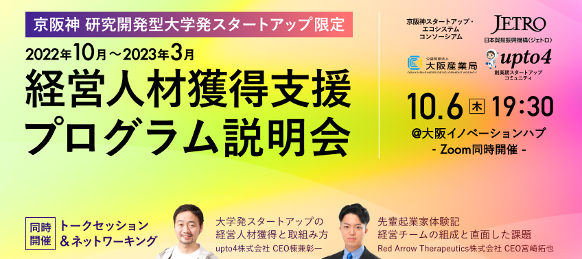 研究開発型の大学発スタートアップのビジネス成長やグローバル展開に向けて、人材獲得・チーム形成における課題解決をめざす【経営幹部人材獲得支援プログラム】のセミナー&ミートアップを、10/6(木)に開催します。