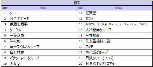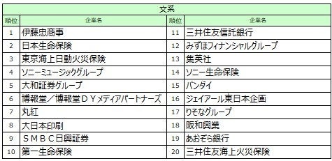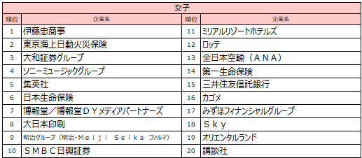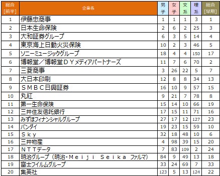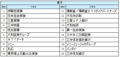 伊藤忠商事は早期調査に続いての首位となり、前半では4年連続の首位と圧倒的な人気を誇っています。五大商社に目を向けると、全てがTOP25にランクインしており、特に男性順位では全てTOP10入りするなど、特に男性からの人気を集めていることが分かります。
