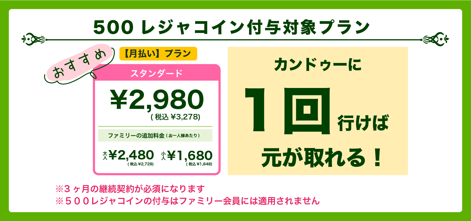 キャンペーン期間中にレジャパスに入会された方には500レジャコイン(7,500円相当)をプレゼントします。レジャコインを使うと会員ではない家族や友達の分も予約できます。カンドゥーの場合、500レジャコインで3人まで無料で遊ぶことが可能です。