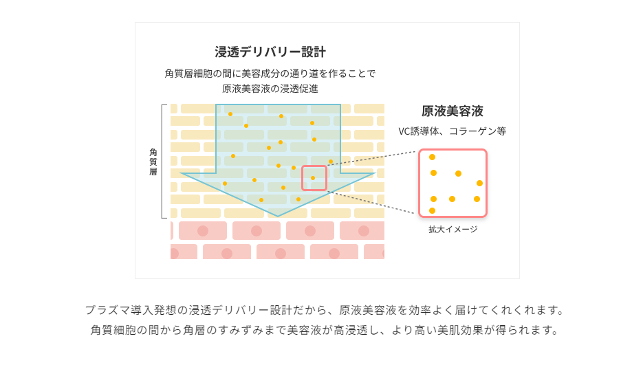 なめらかな肌触りの超極厚シートが美容液をたっぷり抱え込み、“45分乾かない*1”保湿力を実現。さらに、角質層の隅々まで浸透*2させる“プラズマ導入”発想の浸透デリバリー設計を採用し、美容成分を肌に効率的に届けます。