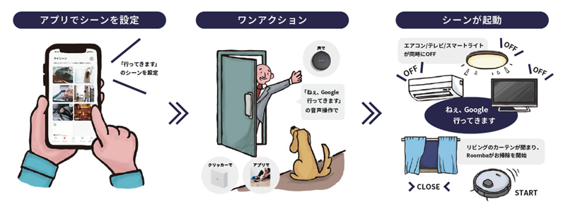 ・アプリで「おはよう」や「行ってきます」といった「シーン」を設定すると、アプリのタップ操作などワンアクションで複数のIoT機器をまとめて動かすことができ、「シーン」で設定したとおりに住空間を制御することができます。