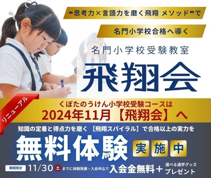 『くぼたのうけん小学校受験コース』が11月にリニューアル。『名門小学校受験教室 飛翔会』として、自由が丘と横浜に新たに開校します。