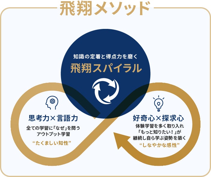 新しくなった『飛翔会』は、子ども達のもっと知りたい・学びたい気持ちを最大限引き出すことで、最良の結果を得られるよう進化。“思考力×言語力”を磨くアウトプット学習と、“好奇心×探求心”を育てる体験学習を繰り返す「飛翔メソッド」で、知識の定着と得点力を養います。