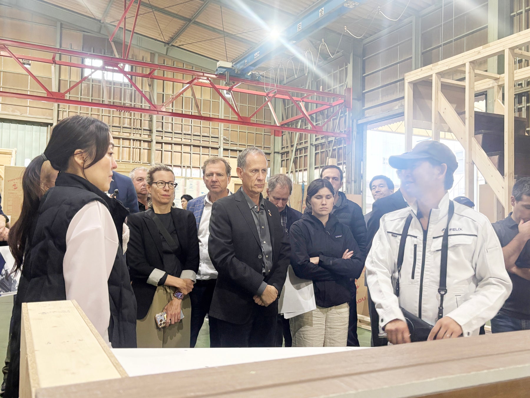 2025年11月12日(水)、カナダ国立研究機構(NRC)およびケベック木材製品輸出振興会(QWEB)を中心とした視察団が、当社の静岡県富士市内の各工場(富士第一工場・富士第二工場・富士開発工場)を訪問しました。視察団は当社が独自開発した技術「FELIX工法7.0」に強い関心を寄せ、予定時間を30分以上延長するほど活発な意見交換が行われました。