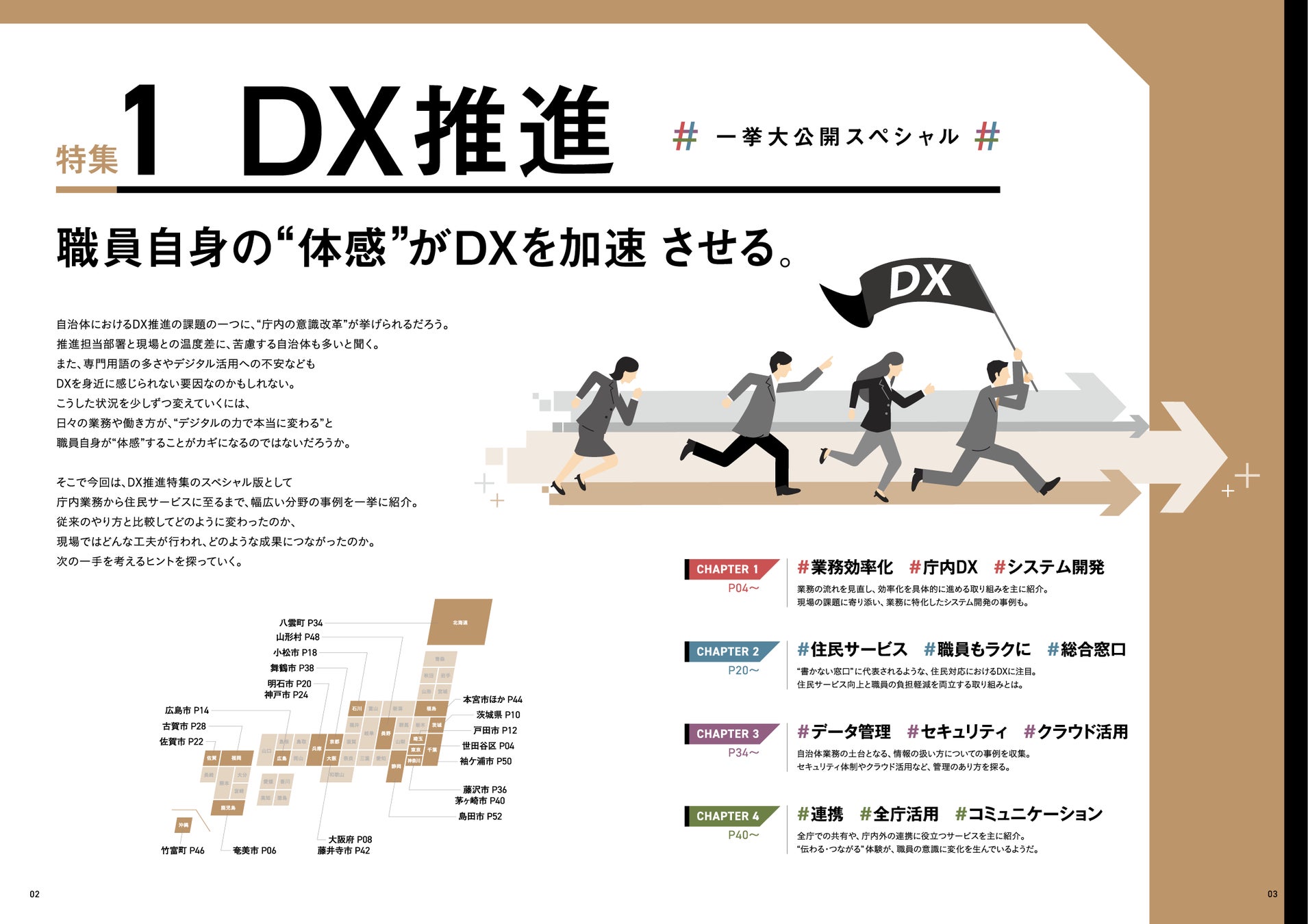 今号の特集1では、「[DX推進]職員自身の“体感”がDXを加速させる。」をテーマに、“一挙大公開スペシャル”としてチャプターを4つに分けました。東京都世田谷区、鹿児島県奄美市をはじめ、多数の事例をご紹介しております。特集2では、「[広報]住民主体の広報がまちへの愛と共感を生む。」をテーマに、奈良県生駒市、島根県海士町などの取り組みをご紹介しております。