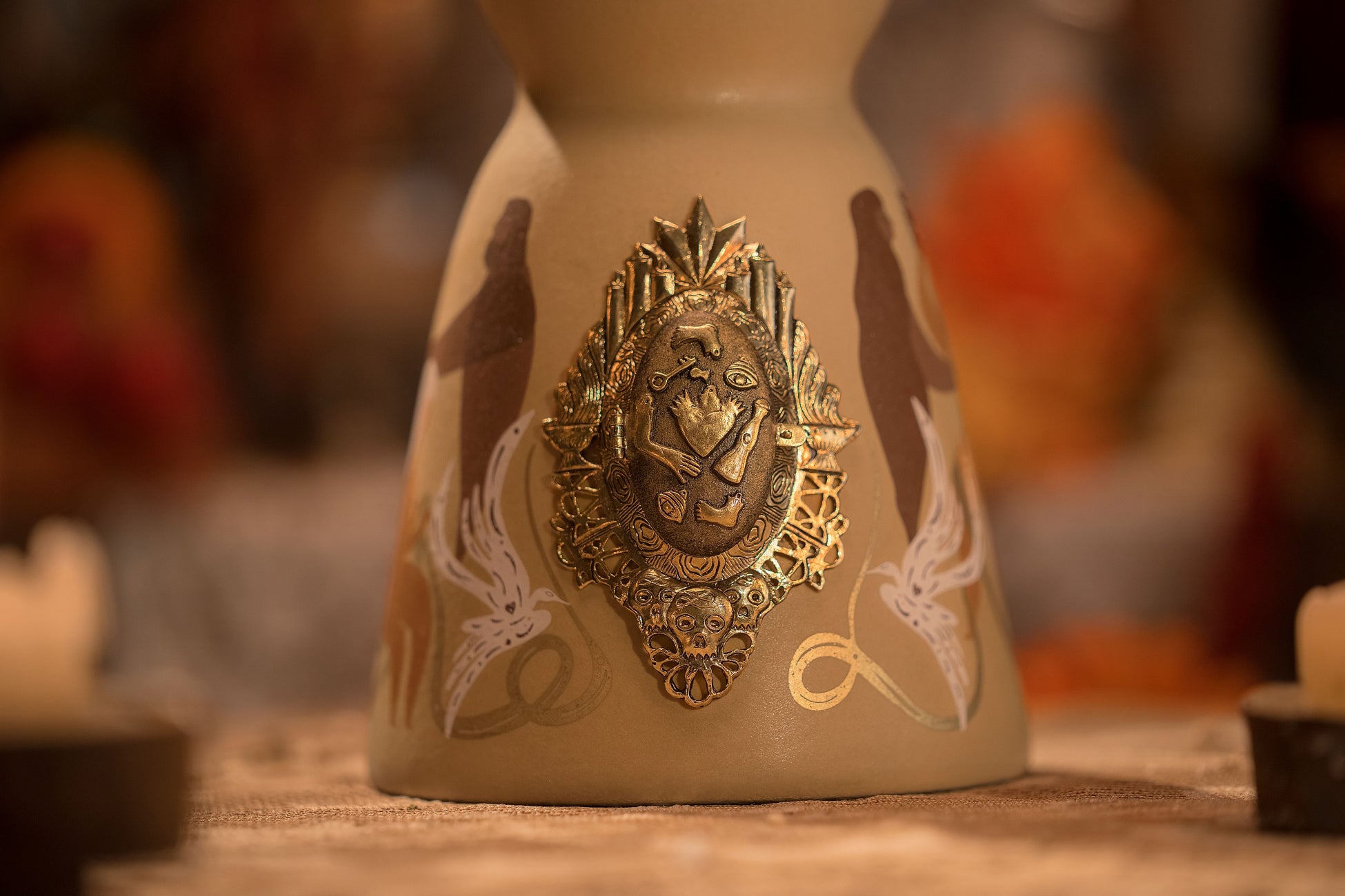 アイボリーカラーの限定デキャンタは、「思い出」へのオマージュとして制作されました。柔らかく落ち着いた色調のパレットが、すべてのものに記憶が宿るような静けさを漂わせ、ボトルのベースには、メキシコ人アーティスト、エリカ・リベラによる伝統的なオフレンダ(祭壇)のイラストレーションが描かれています。マリーゴールドやパン・デ・ムエルト、キャンドル、シュガースカルなど、死者の日を象徴する要素が表現され、偲ばれる人々は柔らかな光の中で精霊として描かれています。本作を飾るオーナメントは、ハリスコ州テシスタンの工房「Milagros de Latón」による手作業の逸品で、24金で鍍金されたロケットが特徴です。内部には黒曜石のカメオが収められ、故人への敬意と永遠の追憶を象徴しています。表面にはミラグリートス(「小さな奇跡」)と呼ばれる真鍮のチャームが精緻なレリーフであしらわれ、それぞれが愛、癒し、守護を意味します。約50工程・12時間をかけて仕上げられるこのオーナメントは、5年にわたる「Nuestros Recuerdos」シリーズの集大成として、メキシコの伝統と職人技の融合を体現しています。