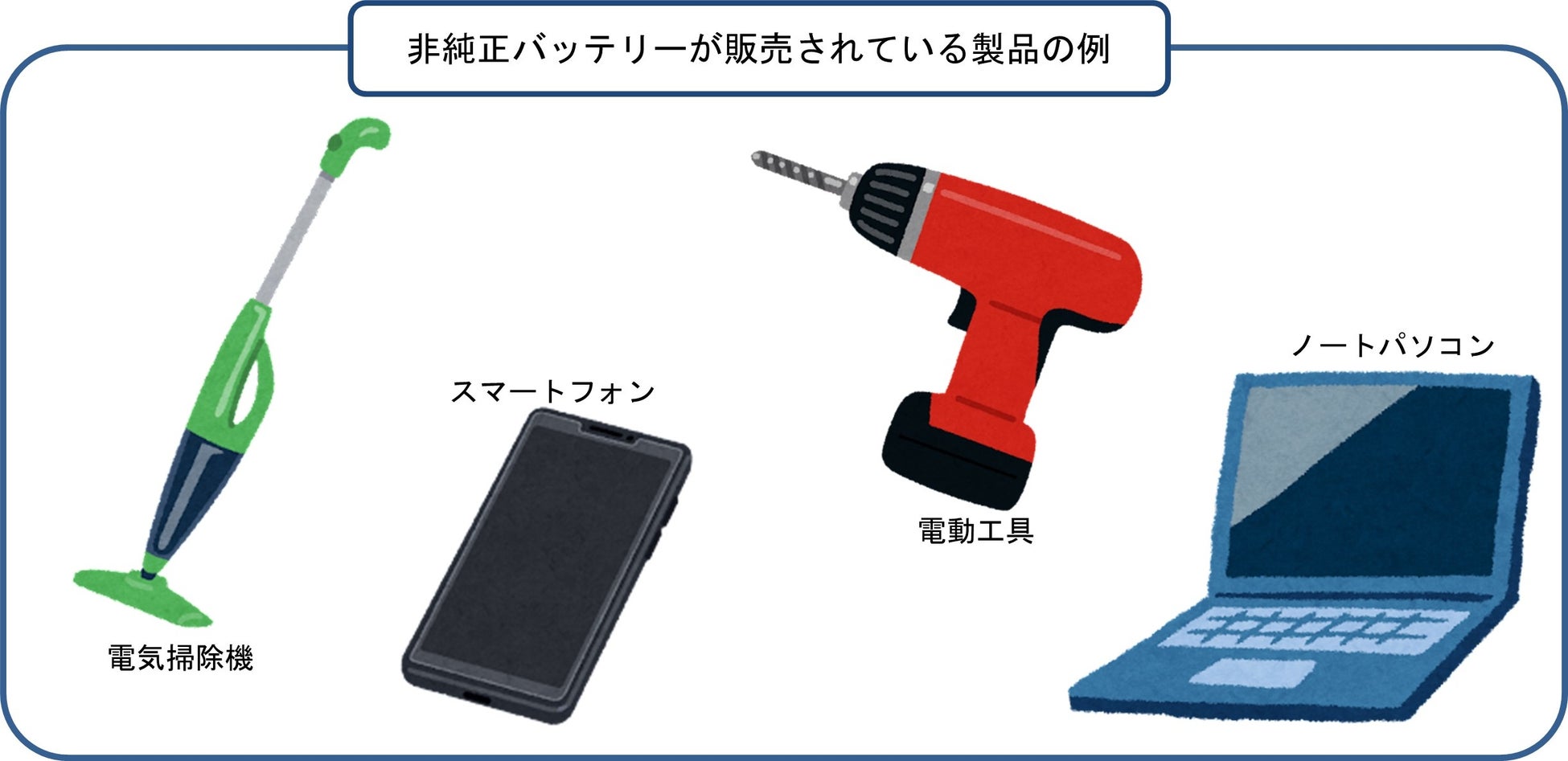 バッテリーパックに不具合があったために発火に至った事故です。バッテリーパックの付け替えが行える製品は、事業者の指定する純正バッテリー以外に他社製の互換品(非純正バッテリー)も市場で流通しています。それら非純正バッテリーの中には、品質の低い安全性が確認されていないものもあるため、購入時には注意が必要です。