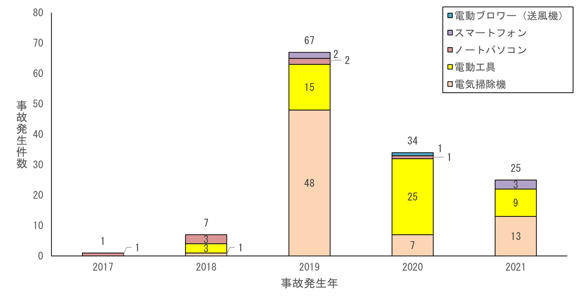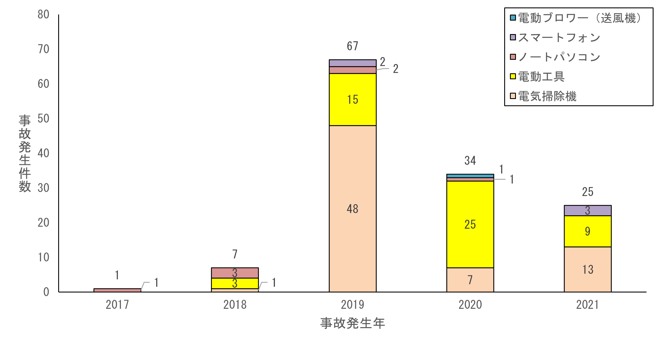 非純正バッテリーによる事故が多く発生しています。独立行政法人製品評価技術基盤機構(NITE(ナイト))に通知のあった製品事故情報では、2017年から2021年の5年間に非純正バッテリーの事故が134件ありました。これらの事故はすべて製品や周囲が焼損した事故です。直近の3年間は事故が多く、毎年家屋の全焼事故が発生しています。