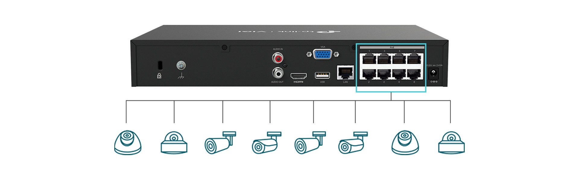 「VIGI NVR1008H-8MP」と「VIGI NVR1004H-4P」は、それぞれ最大8/4チャンネルの同時再生に対応したネットワークビデオレコーダーです。カメラを繋ぐ各ポートでPoE給電も可能となり、設置面での手間やコストを大幅に削減できます。