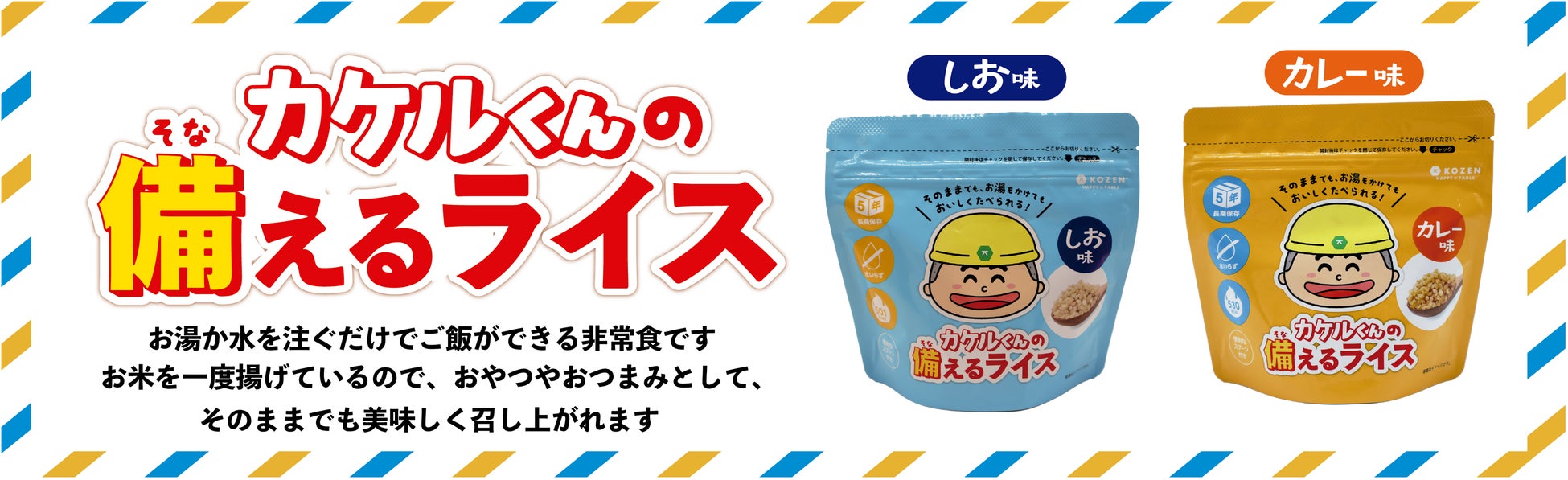 本商品は、同社の人気の海苔フレークシリーズ「のりカケルくん」のオリジナルキャラクターを起用した防災食シリーズの一環です。既にご好評をいただいている「カケルくんの備えるライス(塩味・カレー味)」に続くラインアップとして、より充実した“おいしい備蓄”をご提案します。