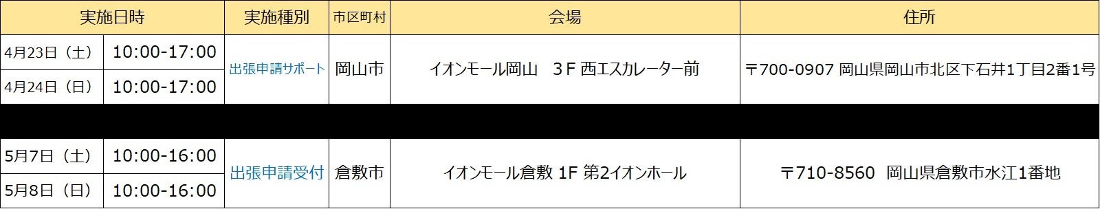 ※開催場所の調整状況や新型コロナウィルスの感染状況等により、「出張申請受付」及び「出張申請サポート」の開催を中止・延期、または実施内容が変更となる可能性がございます。