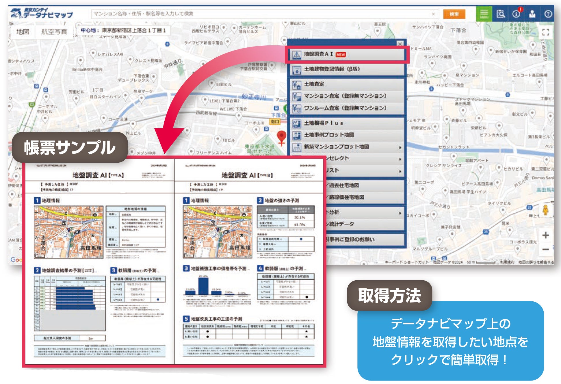 「地盤調査AI」は、東京カンテイのWEB会員制データサービスの1つで、地図上で情報を取得したい地点をクリックすると、地盤の強さや腐植土の有無、さらに地盤改良工法や改良工事概算費用などの地盤情報をAIが予測し、簡単な操作でレポート出力が可能です。