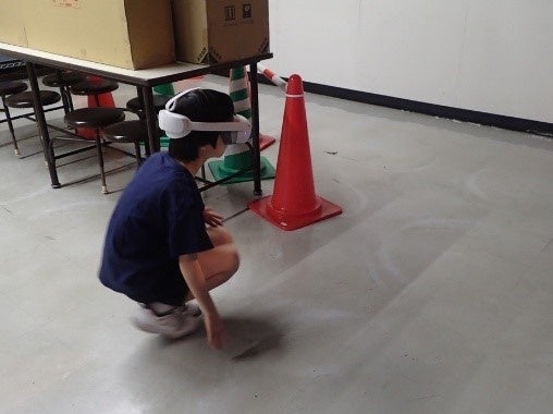 ARゴーグルを装着し、室内に火災で煙が充満した状況を仮想的に再現します。