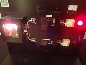 この展示では電線の劣化や断線などで電線が細くなってしまったパターンを例に、抵抗値が増して赤熱してしまう様子を、ニクロム線を用いた疑似装置で体験します。