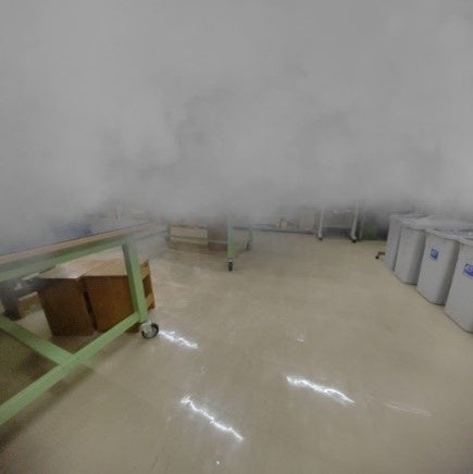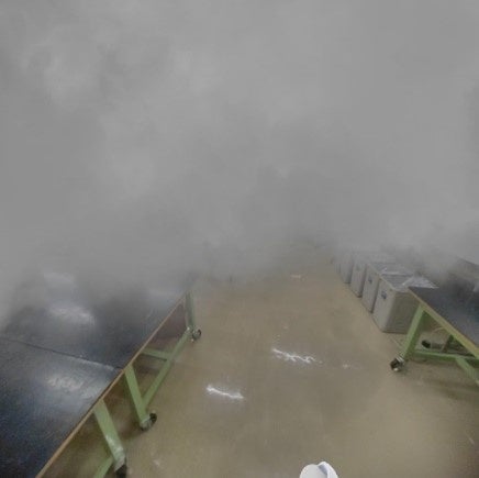 ゴーグルを装着すると目の前の風景は装着する前と同じ風景なのに、煙が充満した光景が広がります。