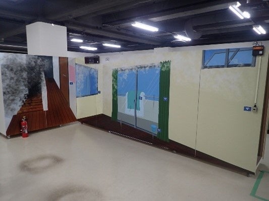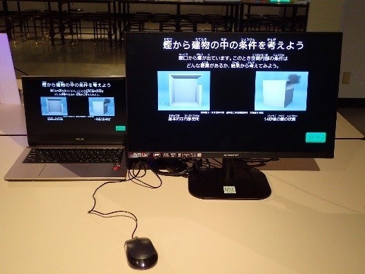 この展示では、PCの画面上に表示される、シミュレーション後の画像から、室内がどのような条件であれば、シミュレーションと同じ煙の流れになるかを推測して選択式で回答します。部屋の構造と排煙の様子で、想定される煙の動きを理解します。