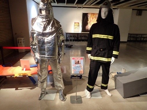 本展示では、防火服と耐熱服の実物2着をマネキンに装着させて展示します。