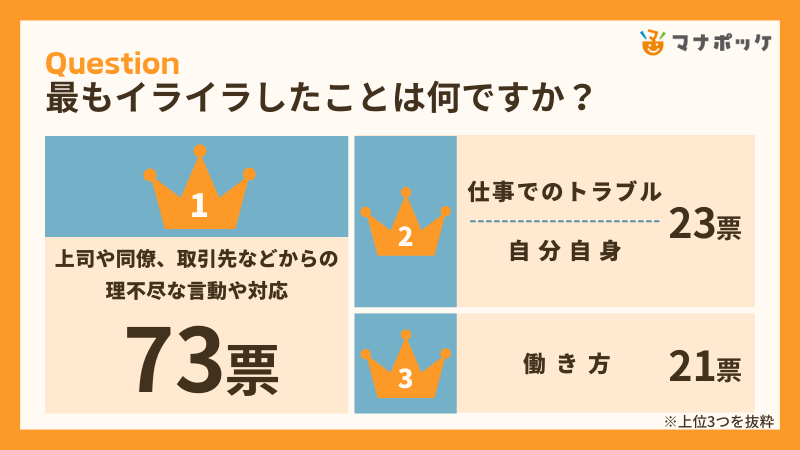 最もイライラしたこと第1位は「上司や同僚、取引先などからの理不尽な言動や対応」73票、2位「仕事でのトラブル」「自分自身」23票、3位「働き方」21票と続きます。