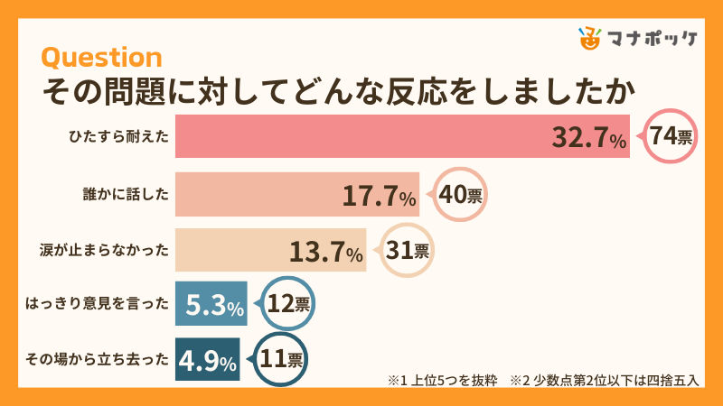イライラしたことへの反応第1位は「ひたすら耐えた」、2位「誰かに話した」、3位「涙が止まらなかった」となりました。どのように過ごしたのか具体的なエピソードを紹介します。