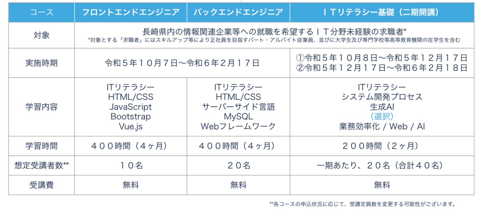 エンジニア養成コースは、約4ヶ月でフロントエンドエンジニアもしくはバックエンドエンジニアとして働ける知識やスキルの習得を目的としています。県内企業へのヒアリング結果に基づき、長崎県で活躍するシステムエンジニアやデジタル化を推進する担当者になるための学習ができるよう設計されています。